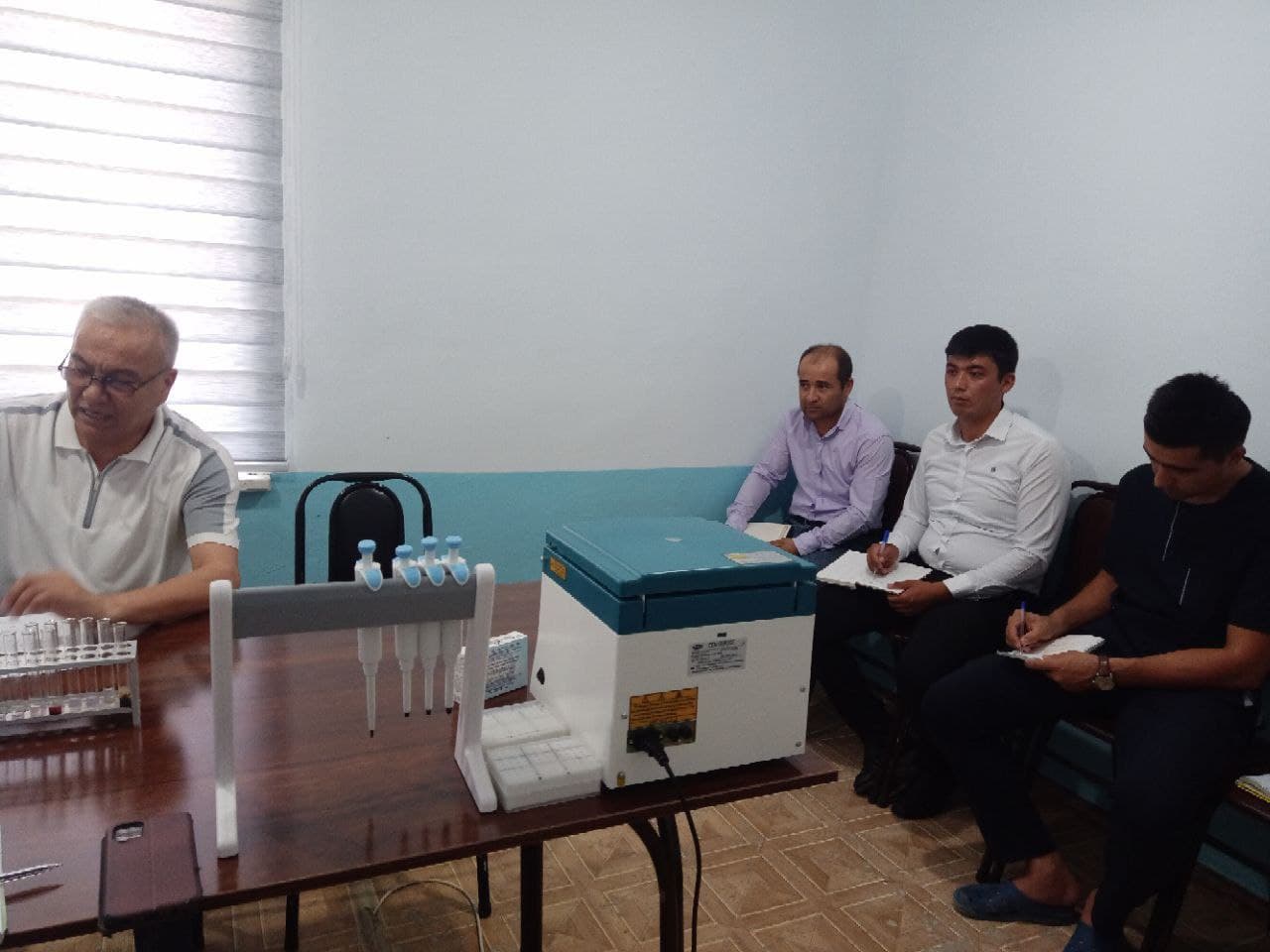O‘zbekiston Respublikasi SSV qoshidagi SEO va JS qo`mitasining milliy referens laboratoriyasi vrach laboranti O.Qosimov tomonidan Qashqararyo viloyatdagi bakteriologiya laboratoriyasi xodimlari o‘rtasida o‘ta xavfli yuqumli kasalliklar, jumladan brutsellyoz kasalligining serologik tashhisoti bo‘yicha amaliy o‘quv mashg‘uloti 2023 yil 2-avgust kuni Muborak tumanining…